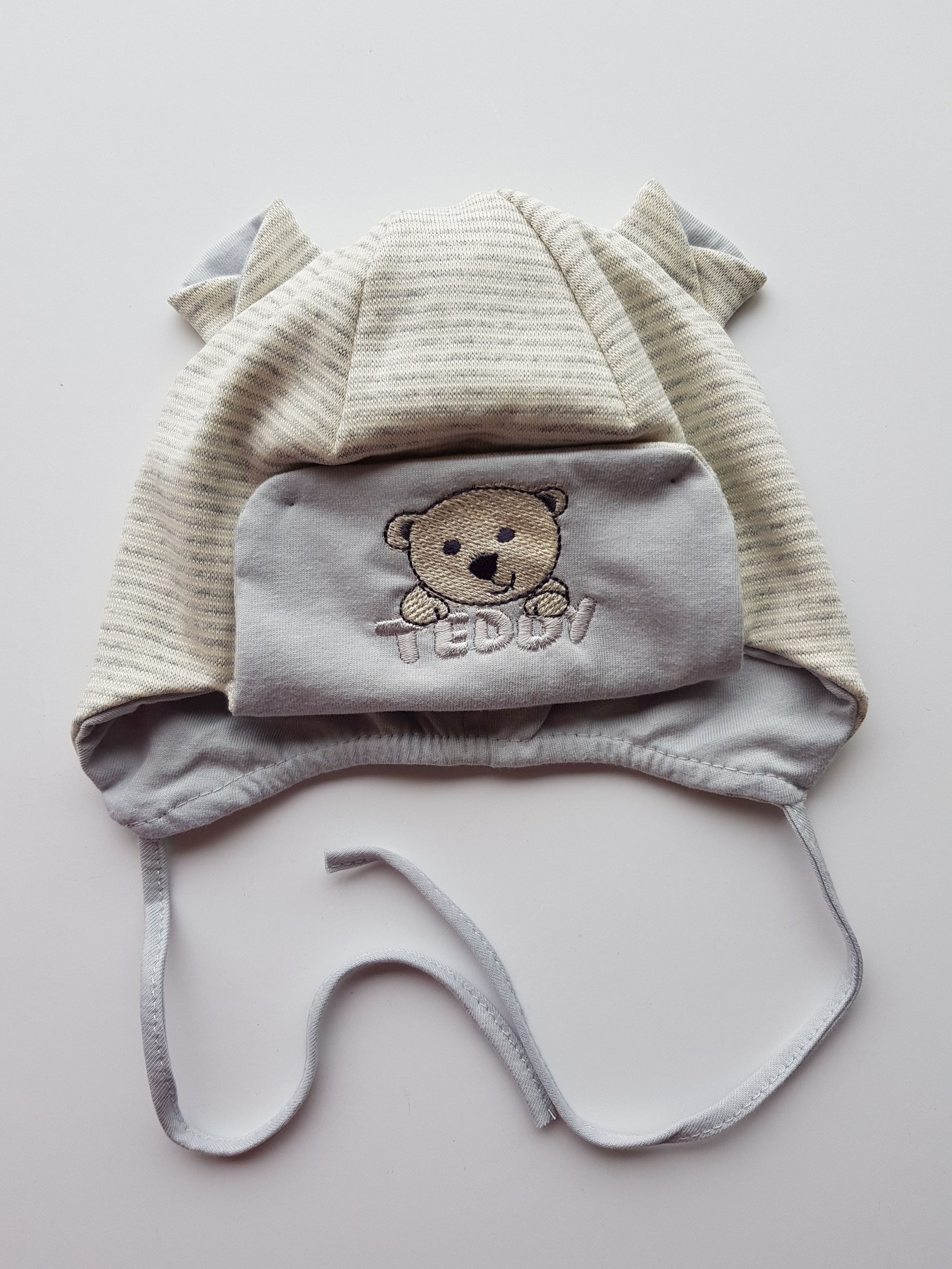 Hats for baby boys with ties. Available in sizes 38, 40, 42, 44, 46. Colours: cream, grey, blue. All hats are striped with white,blue,grey and cream rim at the front.